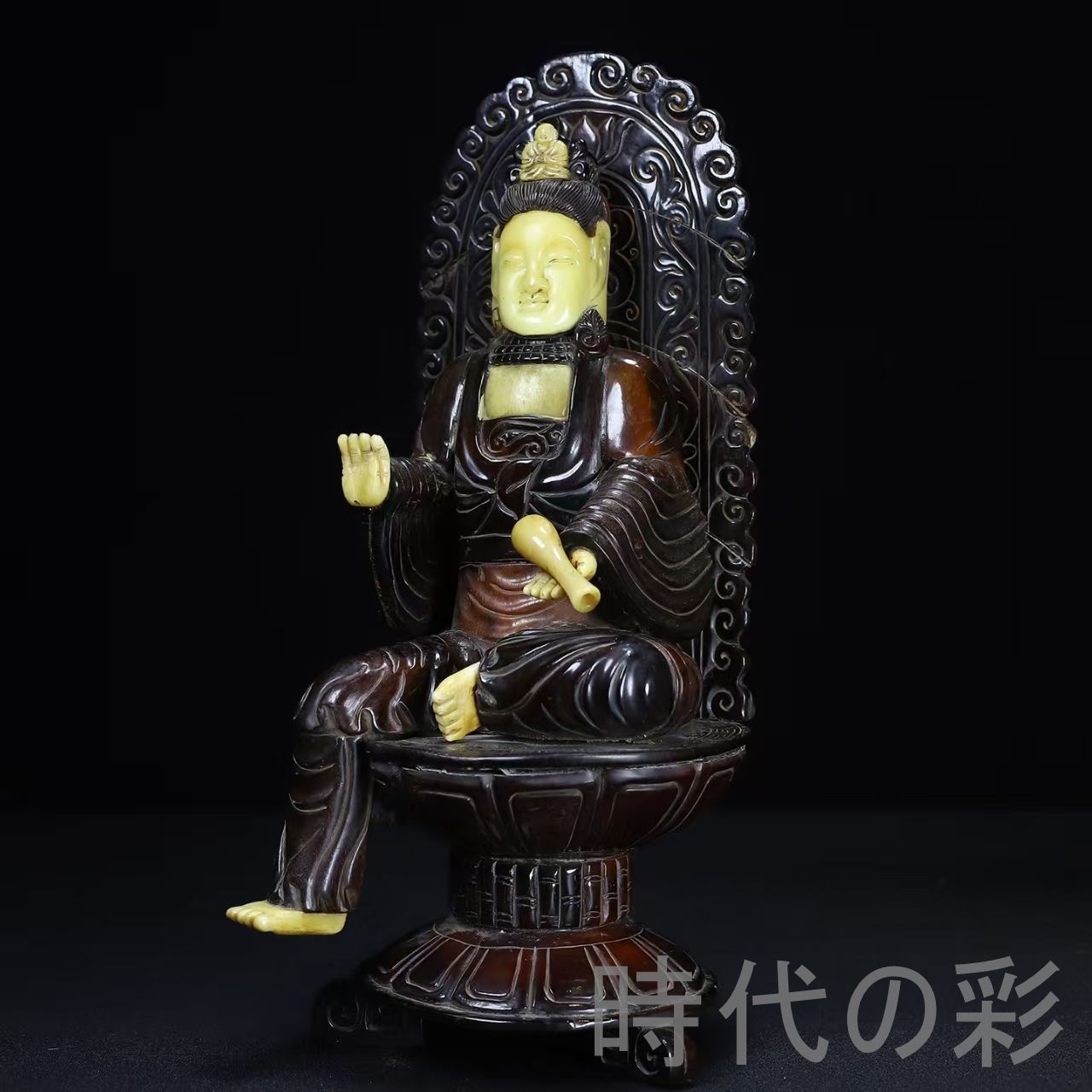 牛角と牛骨を組み合わせ、背光表現を施した観音像。素材の対比が美しく、工芸性の高い仏教美術作品です。