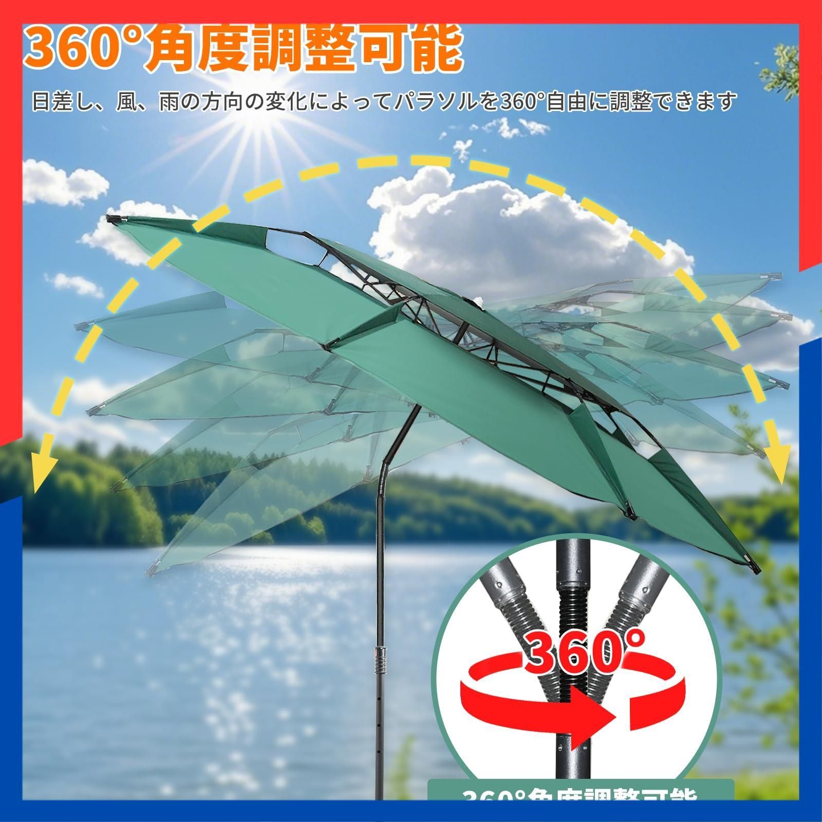 【360°角度調整・UVカット】便利なチルト機能、日差しの変化によってパラソルの角度を360°自由に調整でき。 UVカット加工の表面に遮光率100%で、夏でも快適な空間を作ってくれます。釣り用パラソルやビッチパラソルとしては最適です。