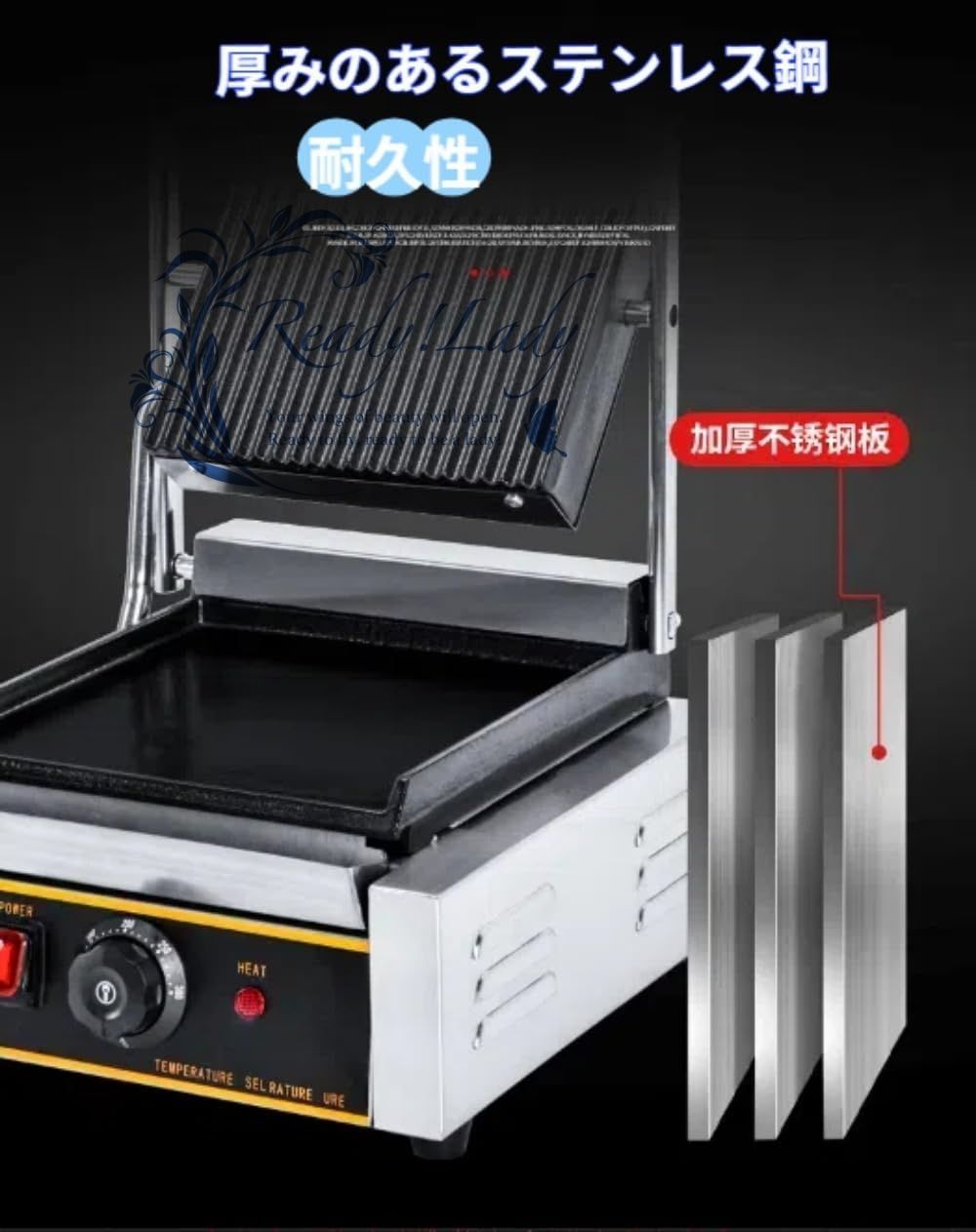 パニーニ クッカー ホットプレート ワッフルメーカー エッグロールワッフルコーンメーカー グリドル プレス鉄板 卓上鉄板焼 業務用グリドル 焼き いか 電扒炉 110 V 50〜300° Cの温度制御 57 39 21 cm 左ピット 右フラット