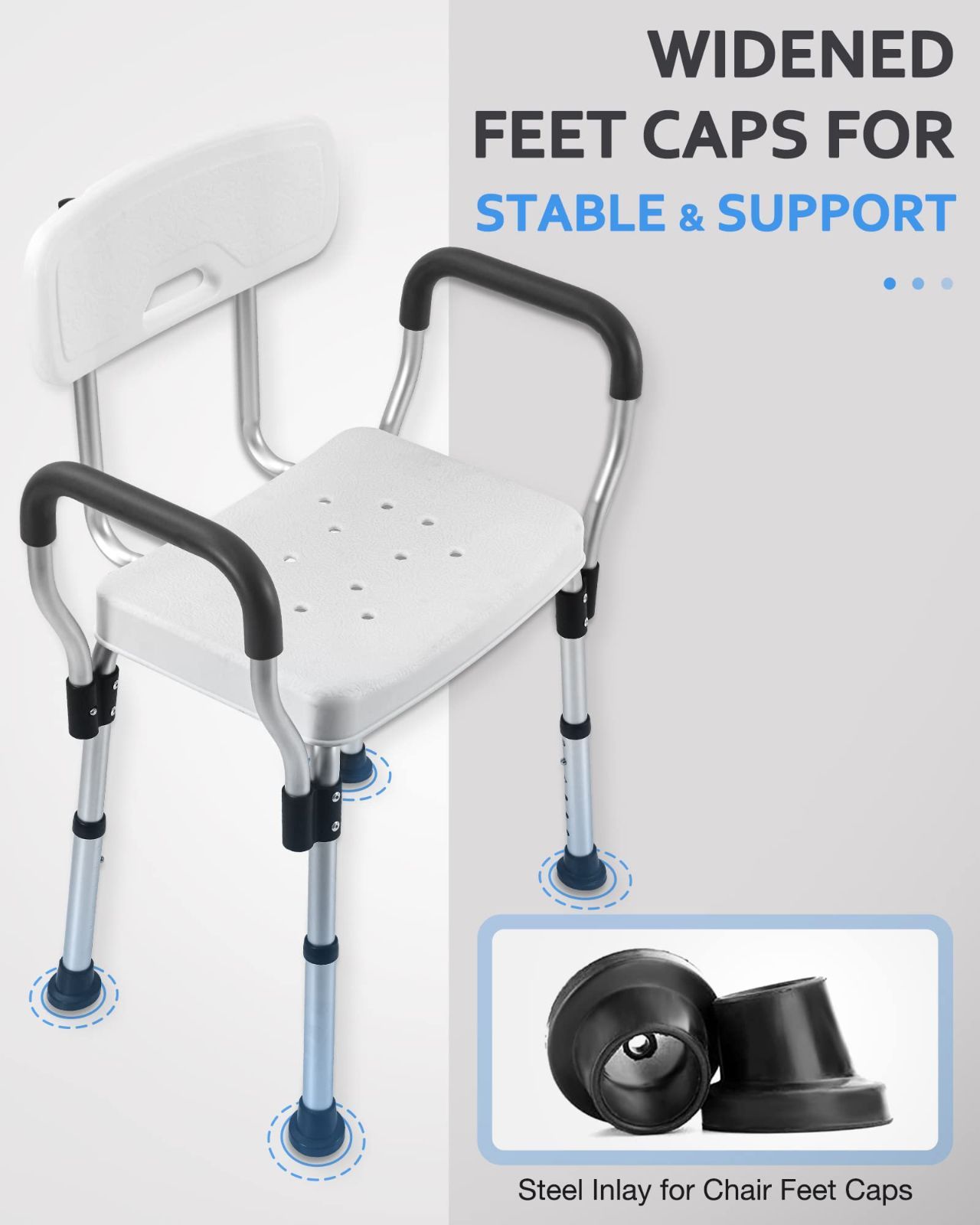 滑り止めデザイン - シャワーチェアは、非常に幅広の滑り止め表面シート(幅16インチ x 奥行き15インチ)を備えています。 シートのユニークな排水穴 効果的に水を排出し、滑りのリスクを軽減します。 シャワーチェアには滑り止めハンドルが付いており、座り心地がよく、2つのハンドル間の距離は24インチです。