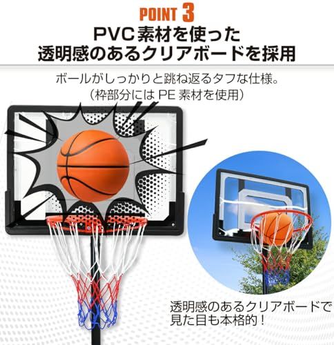 【見た目も楽しめるクリアボード仕様】PVC素材の透明感あるクリアボードを採用し、家庭用ながらコート気分を演出。子供でも使いやすいリング内径約37.5cmで、小さいボールから7号球まで使用可能です。※通常のリングサイズ(内径45cm)とは異なります。