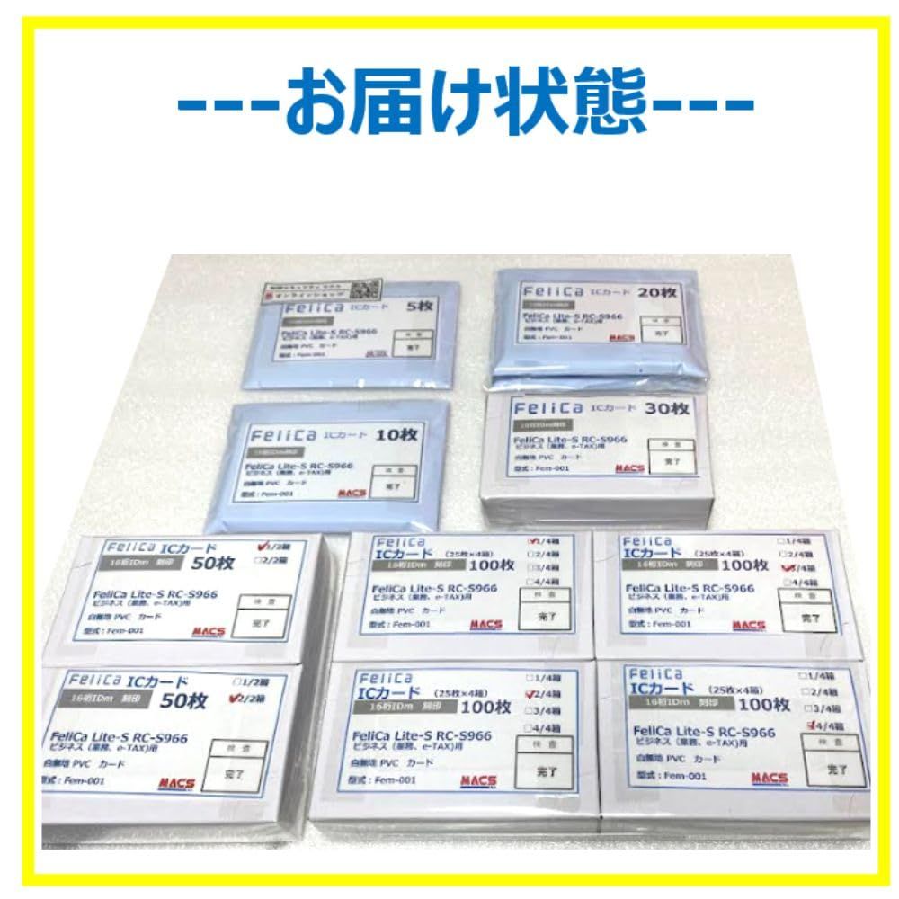 製品仕様 アンテナサイズ 76*45mm カードサイズ 85.6×54mm カードの厚さ 0.84mm カード素材 プラスチック(pvc) 電子仕様 チップタイプ FeliCa Lite-S(フェリカ ライトS) RC-S966 プロトコル ISO/IEC18092 動作周波数 13.56 MHz 読書距離 0-50mm (周辺環境やリーダライタ機器によって異なります) メモリ 240byte 使用可能なメモリ 224byte 持久力 50万回以上 データ保持 10年以上 品質 100%テスト 専用読み取りリーダーNAF-Σにて 出荷前 全数検査実施) 環境 動作温度 -25 ℃?70 ℃ 保存温度 -55 ℃?125 ℃ 型番:Lite-S RC-S966 FeliCaチップ、寸法:85.5×54×0.8mm、材質:プラスチック、重量:約6g、通信:FeliCa 通信方式, NFC(ISO18092)Passive mode に準拠、チップ名称:FeliCa Lite-S、チップメーカー:ソニー株式会社、通信距離:5cm、チップID番号:16桁、システムコード:未設定、サービスコード:未設定、NDEF仕様:未フォーマット 5枚・10枚・20枚・30枚・50枚・200枚・300枚・500枚がございます。 本商品は型式:Fem-001です。真っ白なブランクカードはFe-001、紐づけはFeh-001になります。 社員証、学生証、ポイントカード、勤怠管理システム、入退室管理システム、セキュリティドア・ロックなどの様々な用途にご利用いただけます。※当商品は業務用になりますので、ご注意ください。