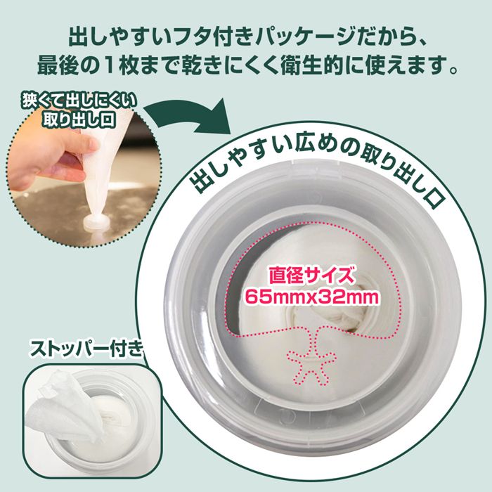 出しやすいフタ付きパッケージだから、最後の1枚まで乾きにくく衛生的に使えます。