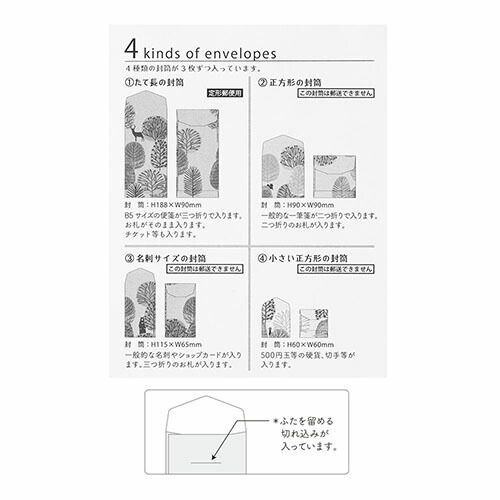 詳細情報森の木々の向こうからのぞく動物達を絵本の様にデザインした4種類の大きさの封筒セットです。
