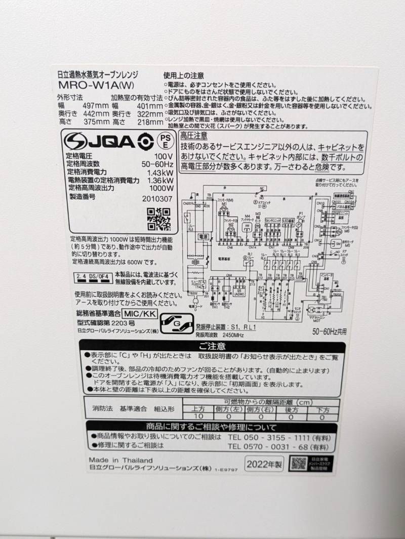 日立 HITACHI ヘルシーシェフ オーブンレンジ MRO W 1 A K 製 通電 簡易 251025