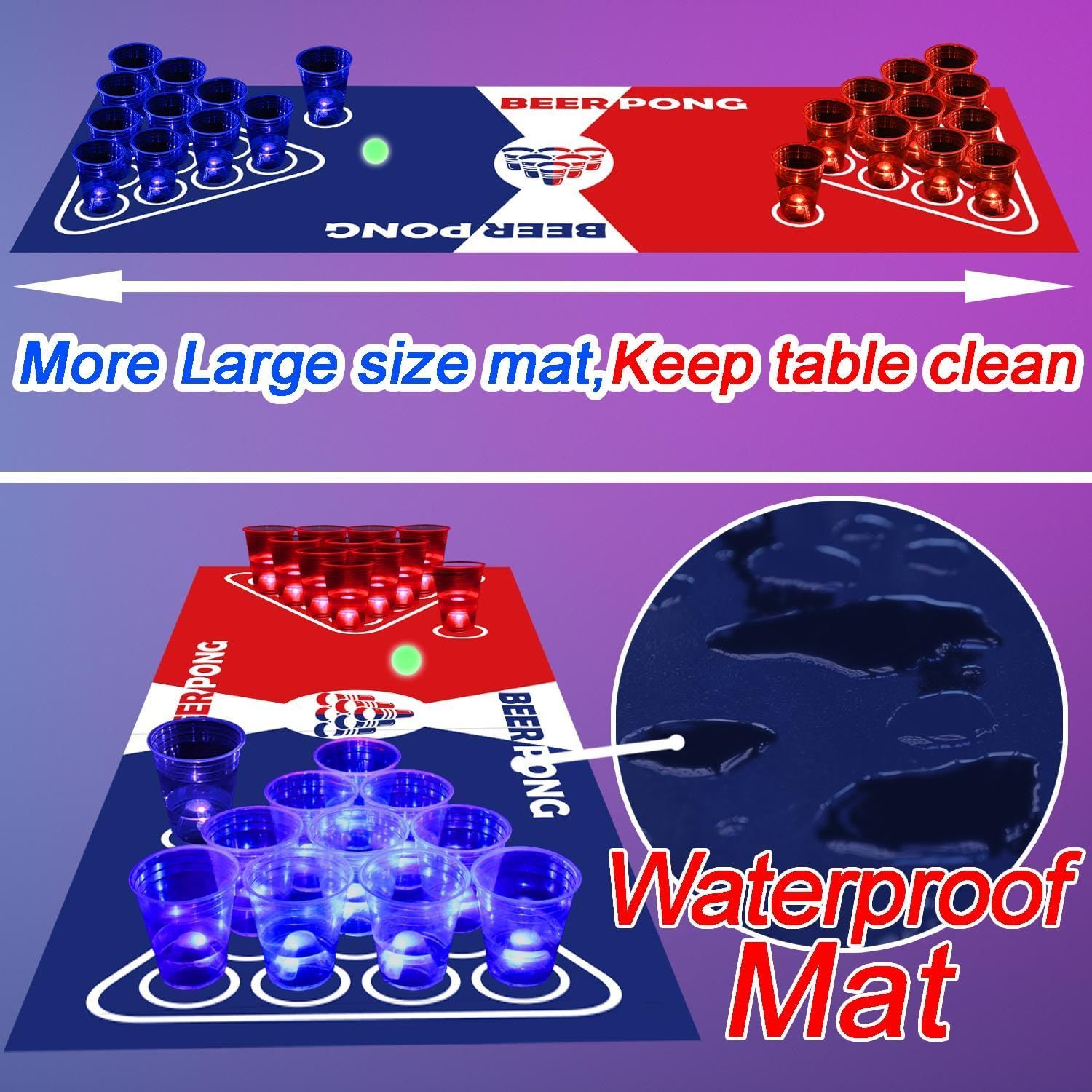 グロービアポンテーブルマットセット:71*23インチのポンゲームテーブルマット1枚、プラスチックカップ22個、LEDライト22個(レッド11個&ブルー11個)、光るポン6個、防水ステッカー22枚が含まれます。