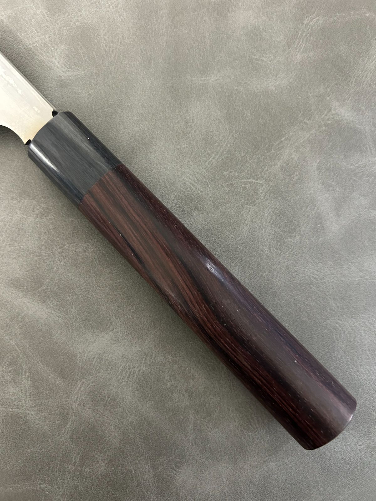 柄は紫檀シノギを使用しており、10層のダマスカスで見た目が美しい和包丁に仕上がりました。