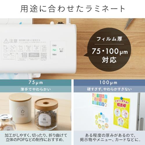 フィルムは「75μm」と「100μm」から選べるので、用途に合わせたラミネートができます。