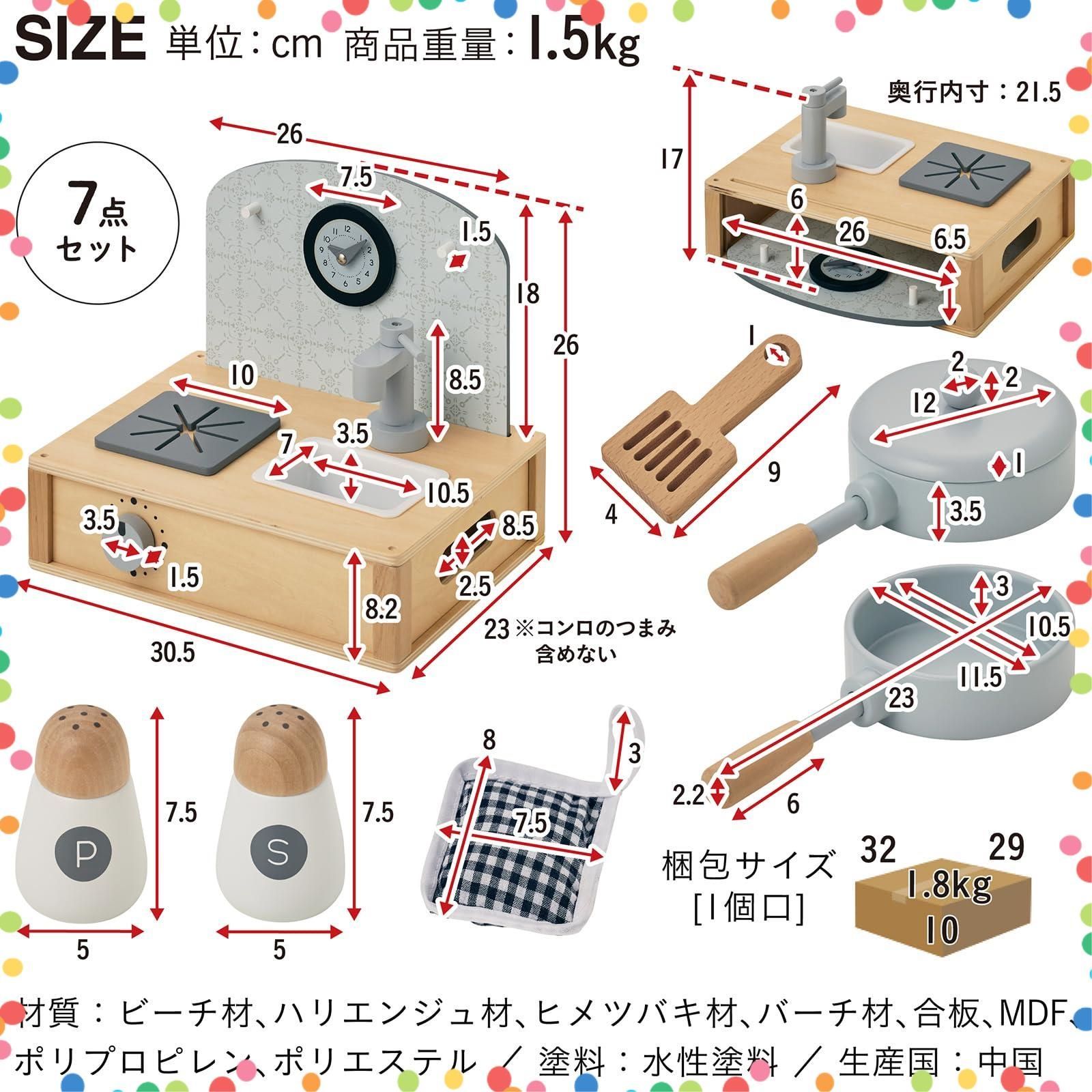 ●内容物/キッチン本体(本体BOX・背板・シンク・蛇口)・フライパン・ふた・フライ返し・なべしき・塩入れ・こしょう入れ ●サイズ/キッチン本体:W30.5 x D23 x H26cm ●材質・塗装/ビーチ材、ハリエンジュ材、ヒメツバキ材、バーチ材、合板、MDF、ポリプロピレン、ポリエステル、水性塗装 ●生産国/中国