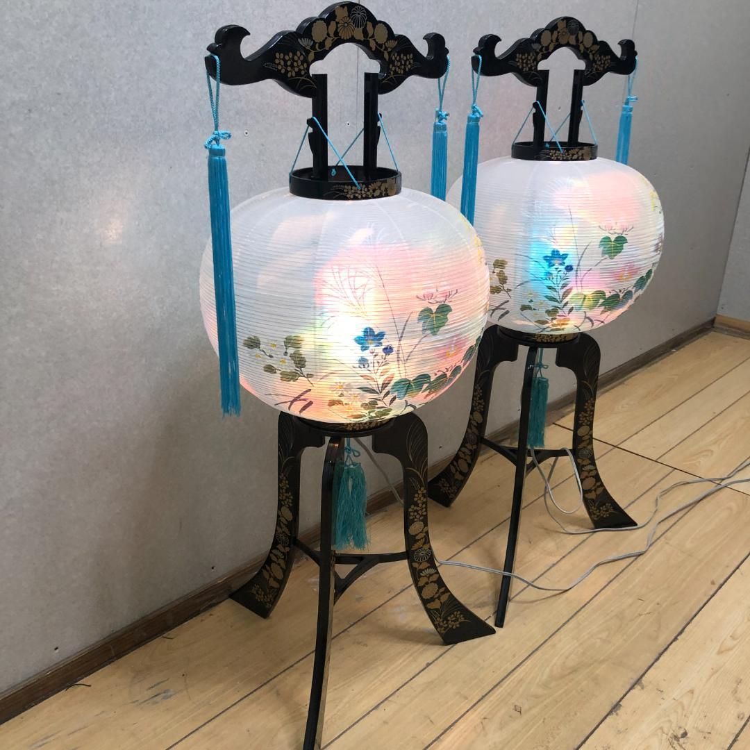 送料無料 回転行灯 尾花型 一対 ペア 盆提灯 回転灯付き 木製台座 花柄 回転行燈 250811-2