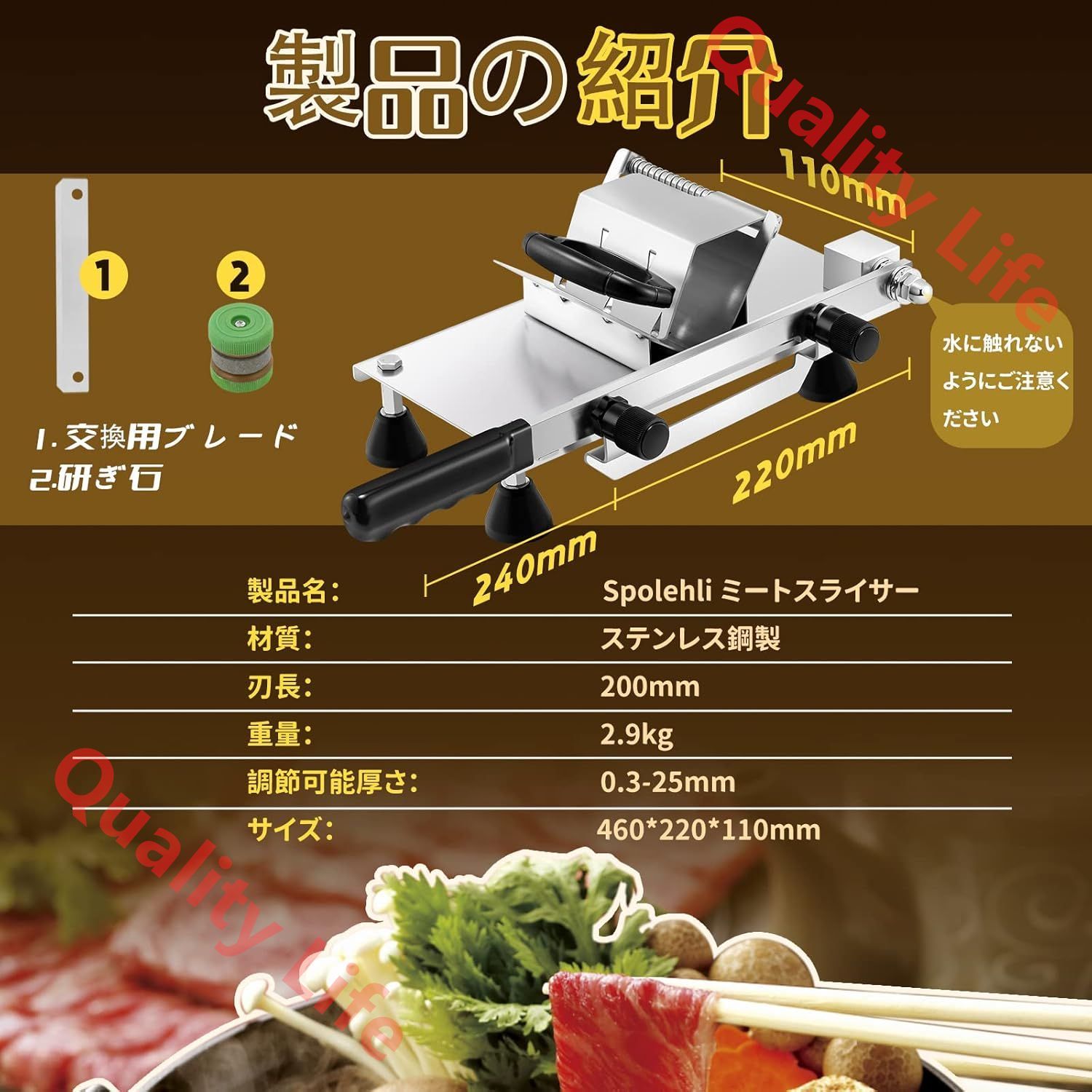 【性能プラス】ミートスライサーは肉押すフタ付き、手が凍るのを心配する必要がありません。研ぎ石と交換ブレード付き、製品の長寿命化を実現します。詳しい日本語説明書付き、簡単に厚さを調節できます。