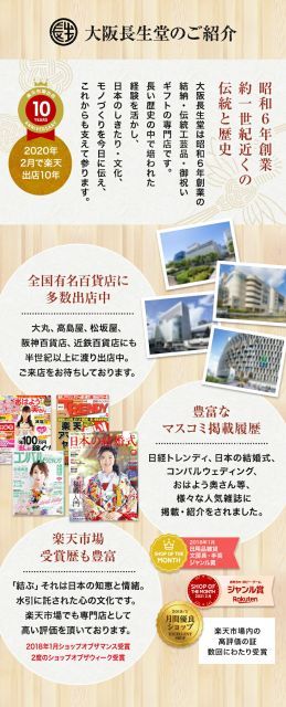 「結納屋長生堂」は昭和6年創業の結納・伝統工芸品の専門店です。大丸・松坂屋・近鉄百貨店・阪神百貨店にも出店しています。