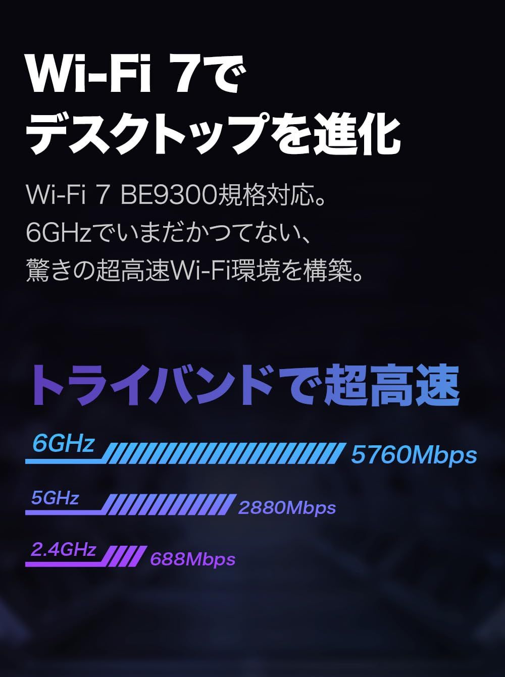 [特徴] Wi-Fi 7対応 PCIeアダプターが登場。5760Mbps(6GHz) + 2880Mbps(5GHz) + 688Mbps(2.4GHz)。