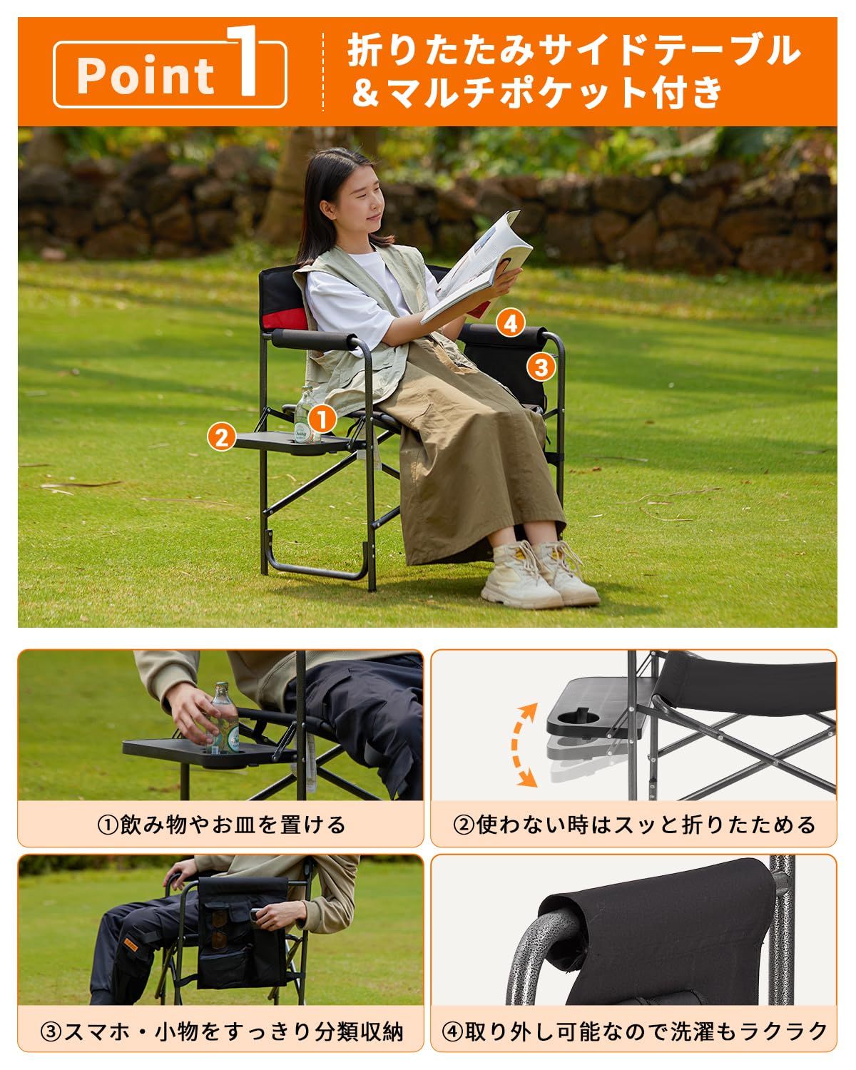 【折りたたみサイドテーブル&マルチポケット付き】飲み物やお皿を置けるプラスチック製サイドテーブル付きで、アウトドアやリビングでのくつろぎ時間をサポート!使わない時はスッと折りたためるので邪魔になりません。汚れても水拭きで簡単お手入れ可能です!さらに、4つの仕切り付き収納ポケットで、スマホ・お菓子など、小物をすっきり分類収納できます。ポケット全体が取り外し可能なので、洗濯や掃除もラクラクです。