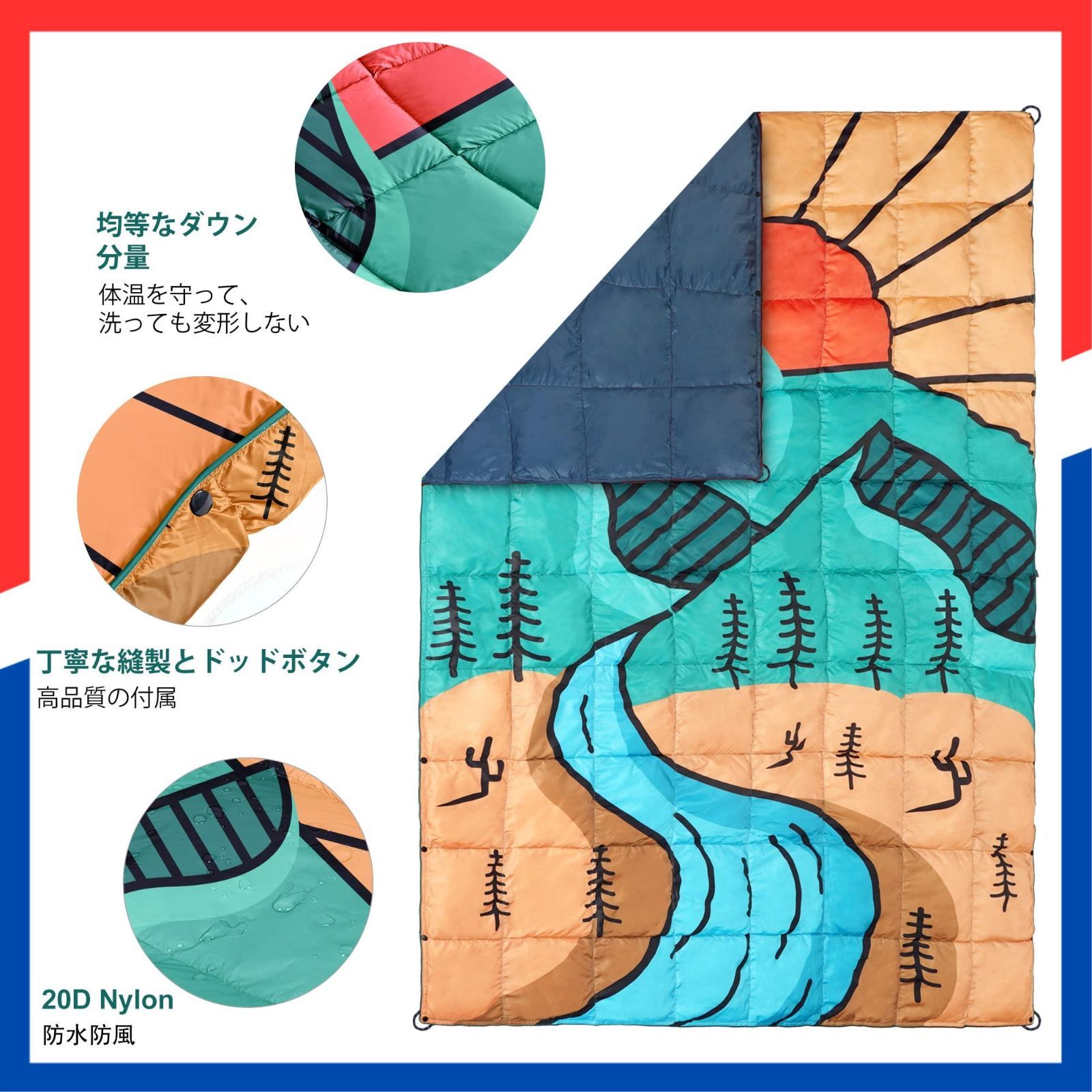 4Monster ダウン ブランケット マルチブランケット 防寒 アウトドア キャンプ 旅行 軽量 防水 防風 コンパクト ひざ掛け 肩掛け 掛け布団 暖かい 柔らかい 収納袋付き 春秋冬使用 プリント-朝日