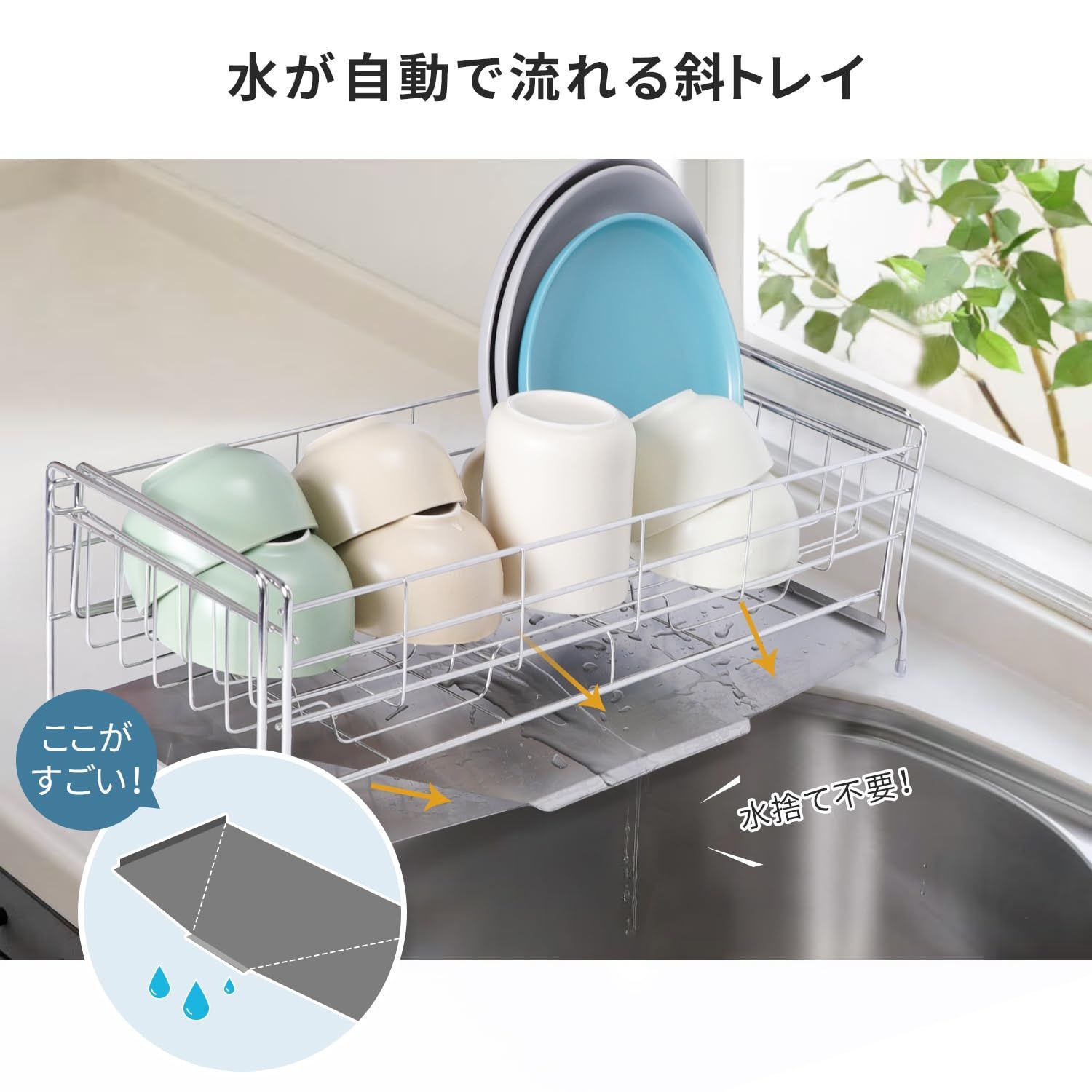 「水捨て不要!排水できるトレイ 」傾斜のついたトレイ、水が自然に集まりシンクへ流れる仕組みになっている。手前のカゴは直接シンクに水が直接落ちる設計。通気性が良く水が溜まらないので水を捨てる手間がかからず、水あかやヌメリが発生するのを抑えてくれ、いつでも清潔に!トレイは取り外して洗えるので、お手入れがラクラク!