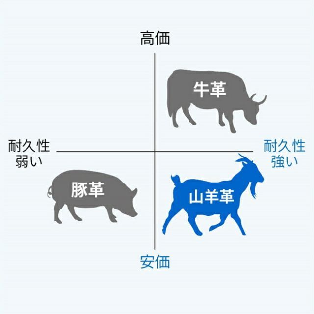 山羊革は豚革と同価格帯でありながら牛革に近い耐久性を持っています。