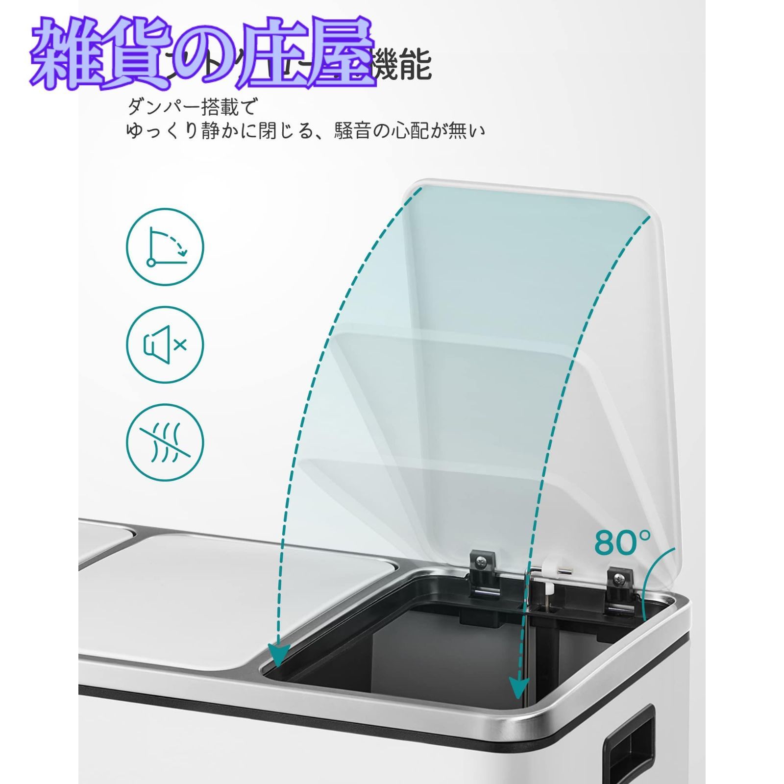 【ペタル式ゴミ箱】蓋はゆっくりとしっかり閉まって、騒音もなく臭いも漏れにくいです。特別な設計で、フタが背面の壁などに当たらないので、限りなく広く開きます。また、ペダル式ですから、料理中でも手が汚れず、壊れる心配もなく、長持ちします。