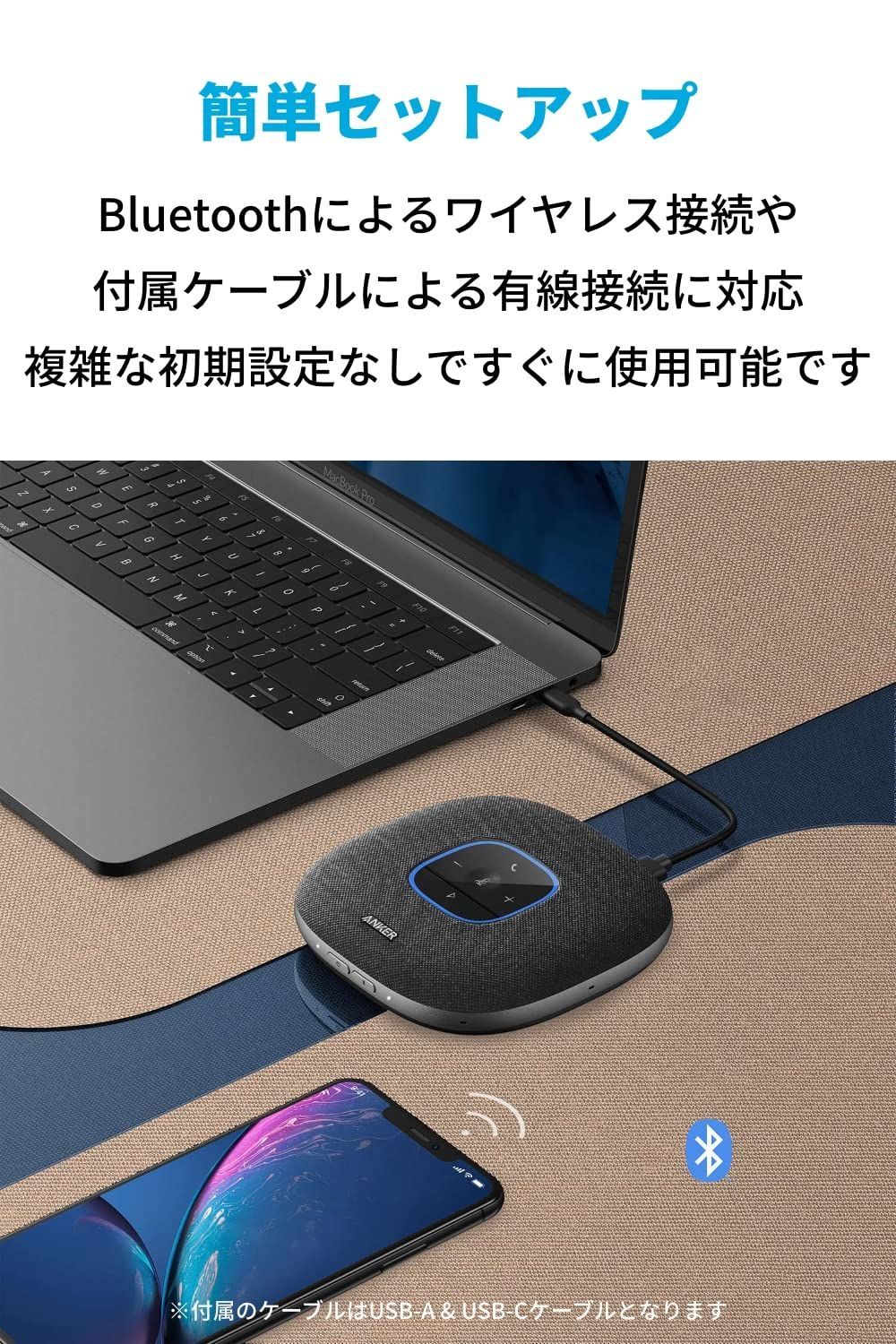パッケージ内容:Anker PowerConf S3、USB-A & USB-Cケーブル、トラベルポーチ、取扱説明書、安全マニュアル 技適マーク認証済み商品(周波数帯:2402MHz~2480MHz)