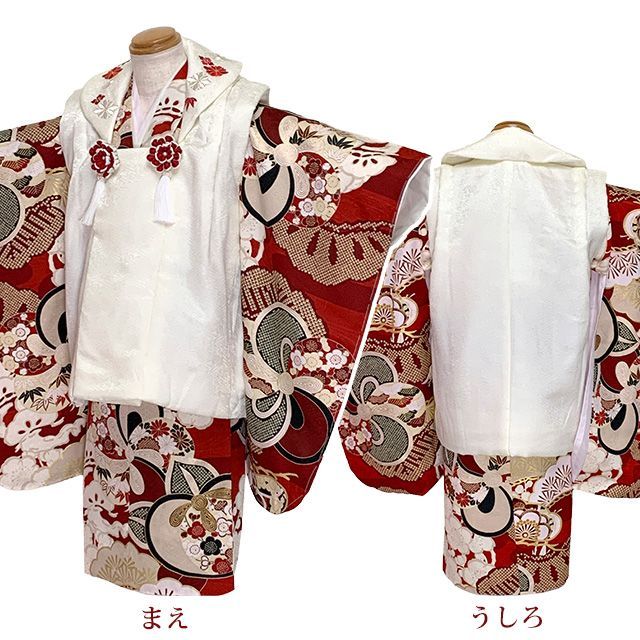 七五三 3歳 着物 紅一点 ブランド 正絹 被布コートセット オフホワイトx赤系 ねじ梅 古典柄 SPF 34