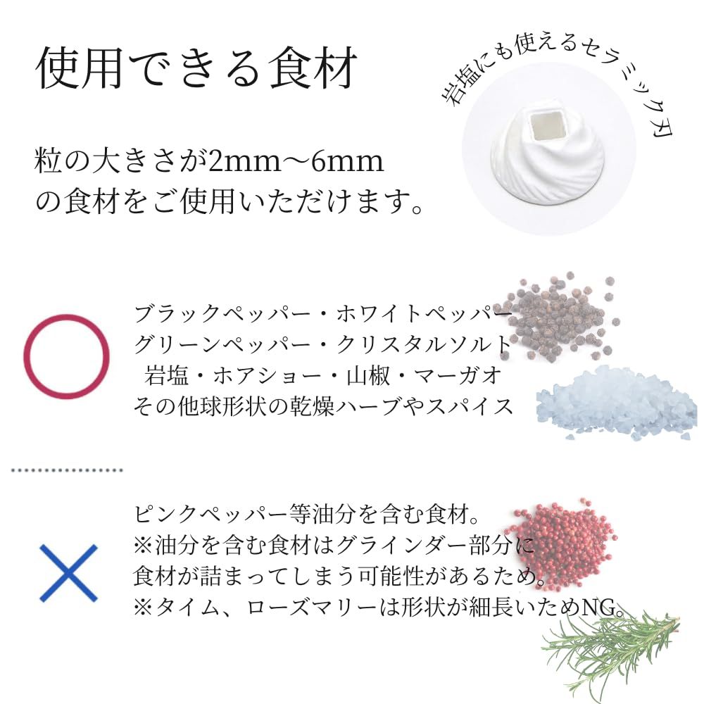 錆の心配がなく、岩塩にも使用できる丈夫なセラミック製の刃を採用。摩擦熱が生じにくいため、熱で飛びやすい胡椒の香りを保ちます。