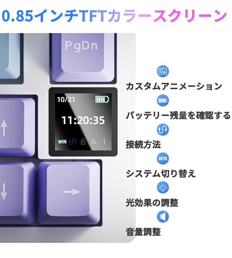 【TFTスクリーン】 AK820pro キーボードには 81 キー 1 金属ノブ TFT ディスプレイ カラー画面があり、TFTスクリーンが搭載されており、インタラクティブインターフェースとしてリアルタイムで更新やカスタマイズが可能です。このワイヤレス メカニカル キーボードは面白くなりました。 Fnノブでバッテリー接続モードなどの表示を切り替えることができます。接続モードを切り替える際は、必ずキーボードを対応システムに合わせてください。 表示機能: 時間、アニメーション、バッテリー残量、Win/MAC、有線/2.4G/Bluetooth モード、音量。 同時に、キーボードはドライバーを介してさまざまな表示画面のテーマパターンのカスタマイズもサポートします。 ノブ機能: スイッチ、ボリューム調整、スイッチモード