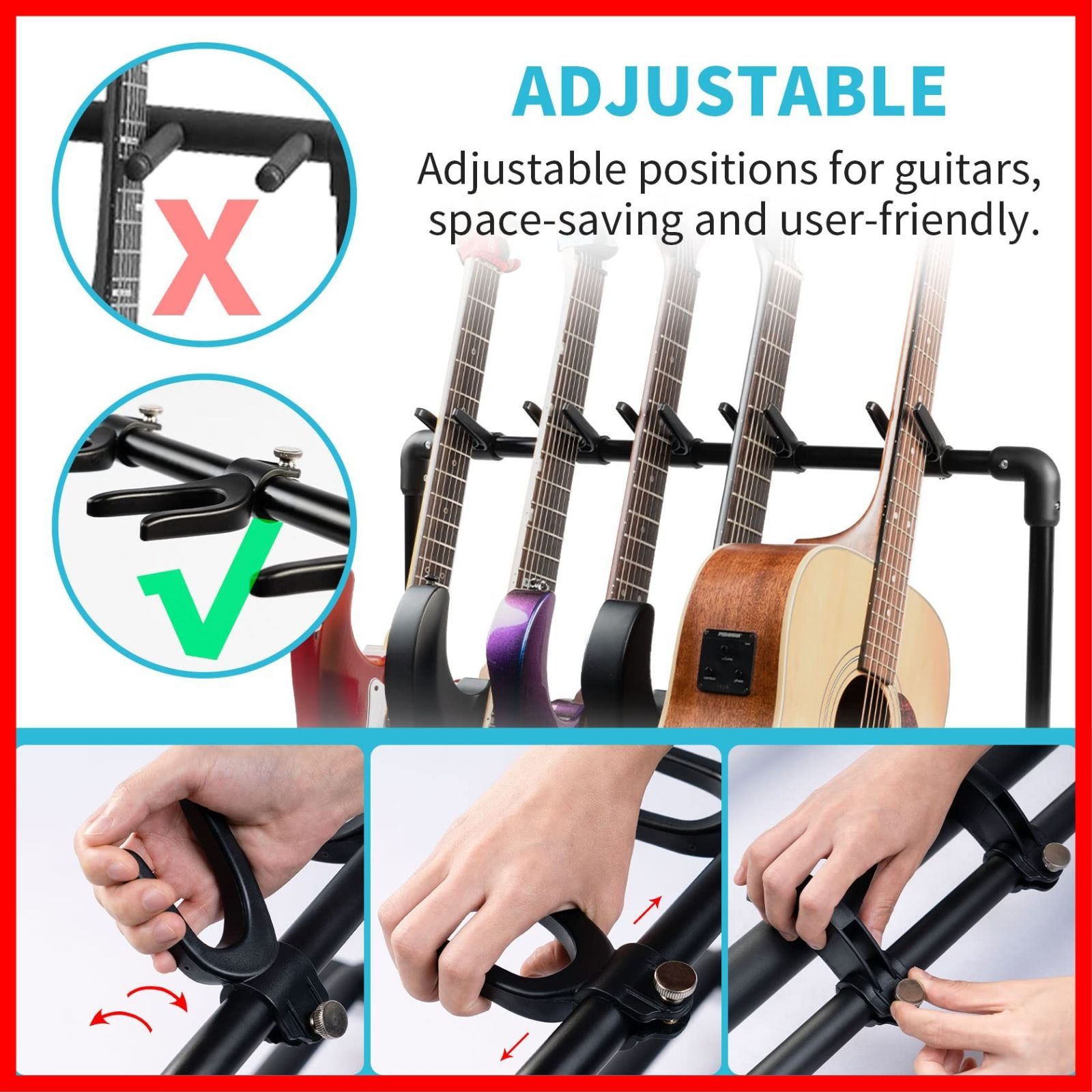 ギターフックは、ギターを固定し、スライドを防ぐために使用されます。 フックは、衝突を防ぐためにギター間の間隔を調整することができます