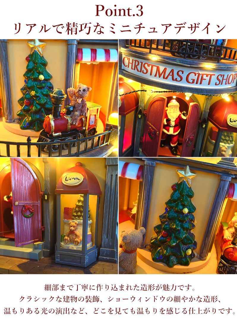 さらに下部の扉が開き、サンタクロースが登場するギミック付きで、まるで物語のワンシーンのように動きを楽しめます。