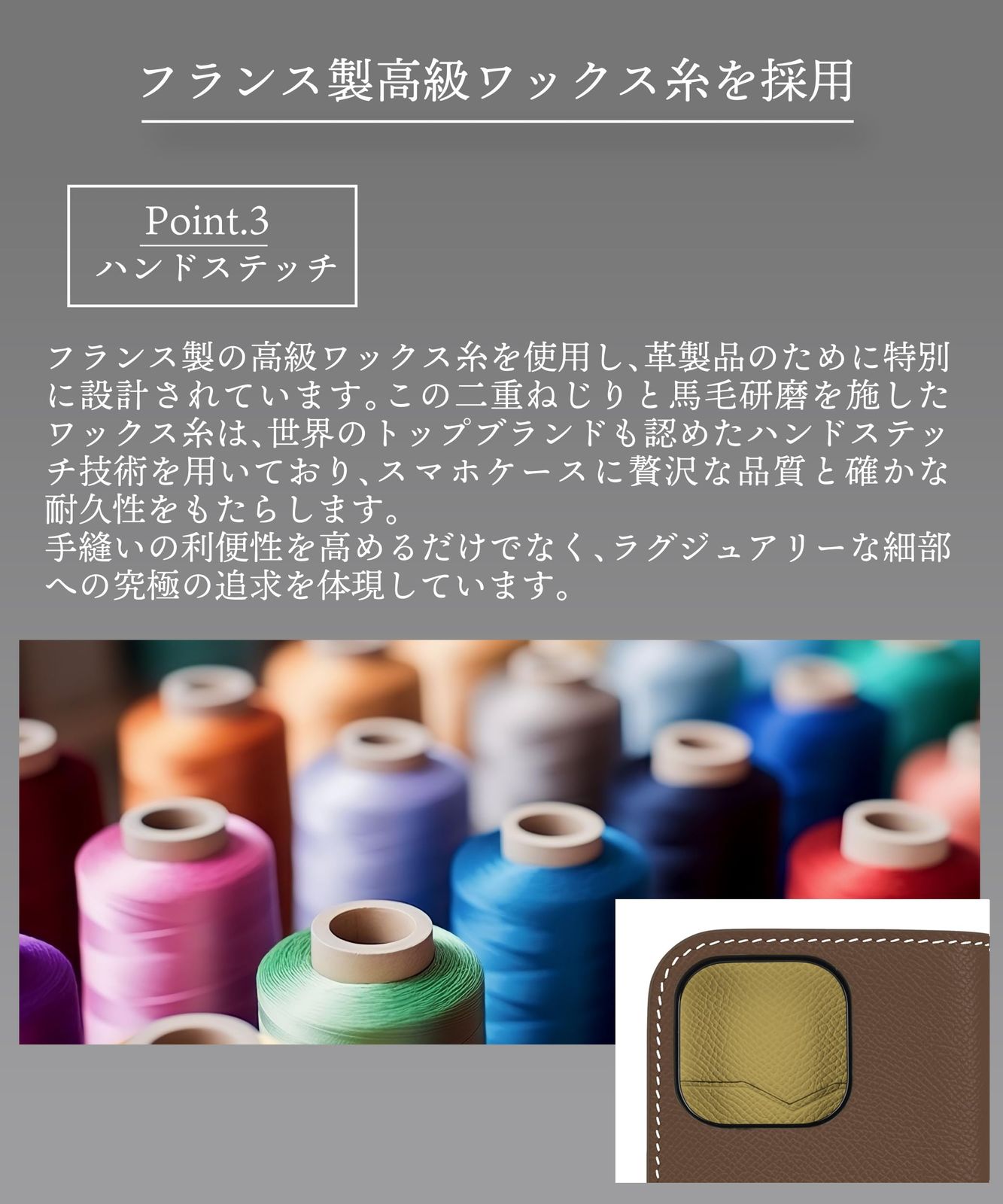 【製法】ハンドメイドにて職人が1つひとつ丁寧に手作りしております。またフランス製のワックス糸を使用し革製品のために特別に設計しております。世界のトップブランドも認めたハンドステッチ技術を用いており確かな品質と耐久性をもたらします。