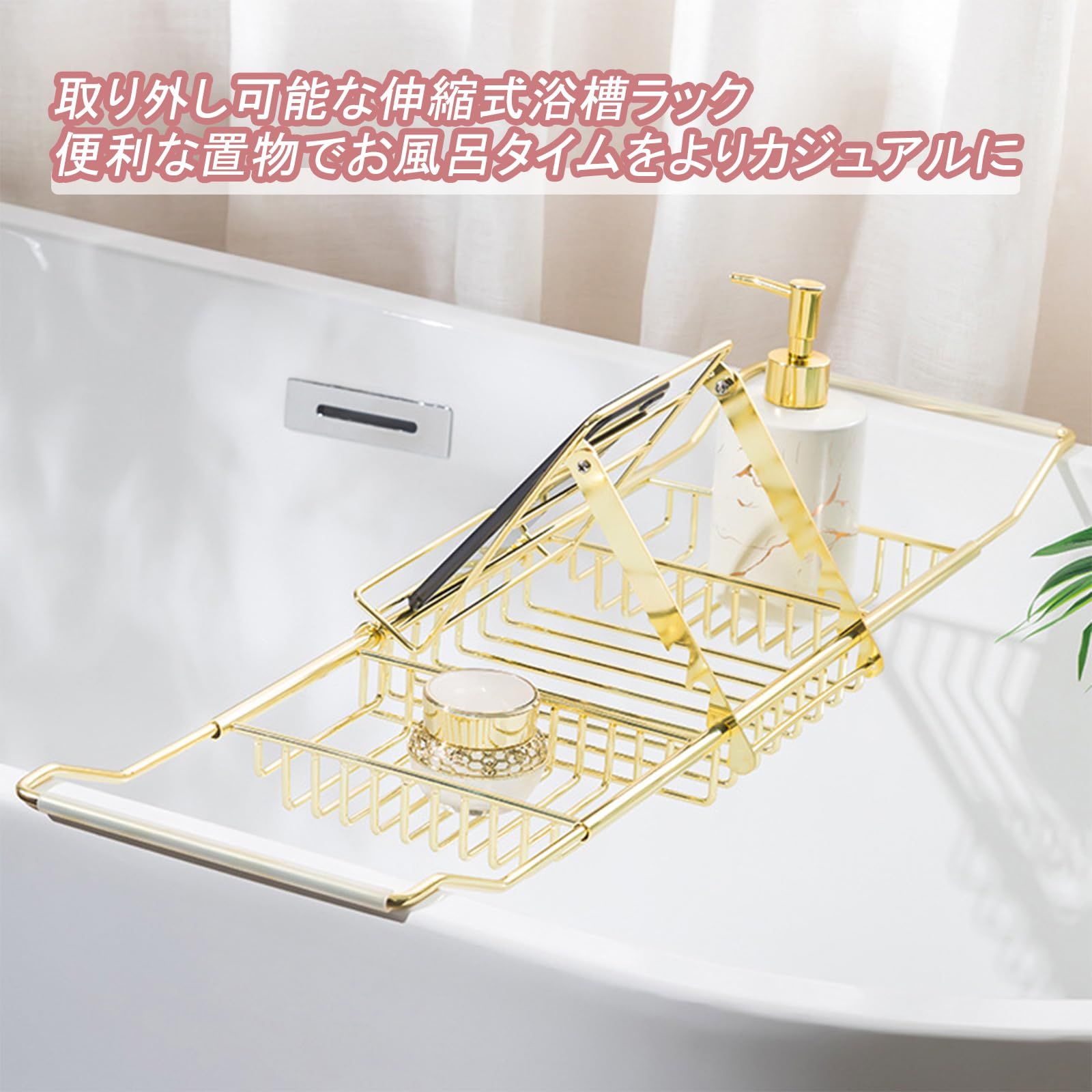 バスタブトレー バスブックスタンド 伸縮式 お風呂 トレー のんびりお風呂 バスグッズ 浴槽ラック 浴室収納 お風呂雑貨置き台 バスタブ 携帯スタンドお風呂 テーブル ゴールド+ブックシェルフ