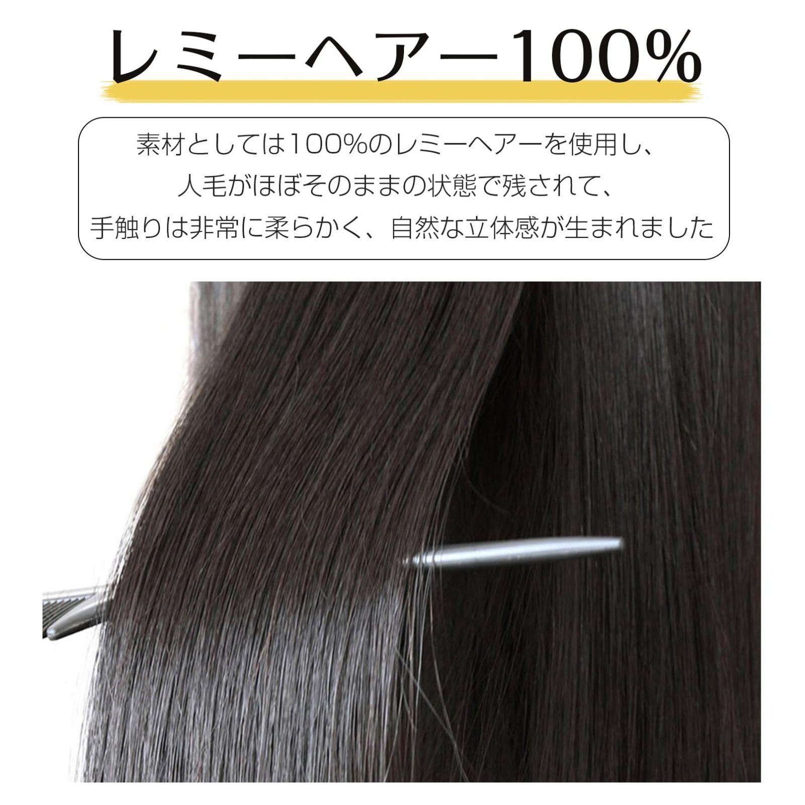 自毛と馴染みやすい:このウィッグには、人毛100%の高級レミーヘアを使用しています。レミーヘアとは、毛髪のキューティクルがほぼそのままの状態で保たれている高品質な人毛のことです。この素材を100%使用することで、ウィッグ全体が滑らかで美しい仕上がりとなっています。キューティクルが保たれているため、髪は自然な輝きとツヤを持ち、手触りも柔らかく豊かな質感を実感できます。自毛と自然に馴染み、見た目の美しさを引き立てます。