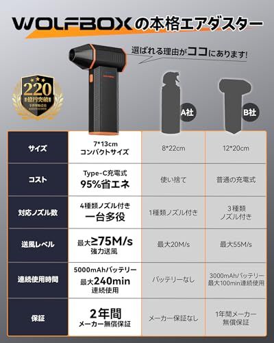 WOLFBOX エアダスター 電動 強力ブロワー 洗車 最大風速75 m s以上 204g超軽量 11万回転 2026最新 水シミ予防 5000 mAh大容量 240分連続稼働 4種ノズル付き 3段階調整 USB充電式 一台多役 年寄りも簡単に使 013 fa 784