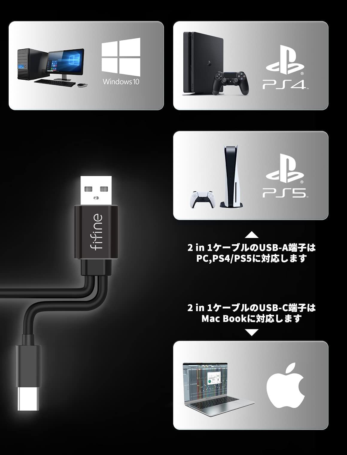 【分岐ケーブルが付属、接続簡単】USB-AとUSB-CのダブルヘッドのUSBケーブルが付属されます。デスクトップPC、ノートパソコン、iPhone、iPad、PS4、PS5などに接続すれば、すぐ使用可能です。(NS/Androidスマホ/Androidタブレットに対応しません)ケーブル長さは約2m、この長さは使用者がより柔軟に移動でき、持ち運びもやすいです。