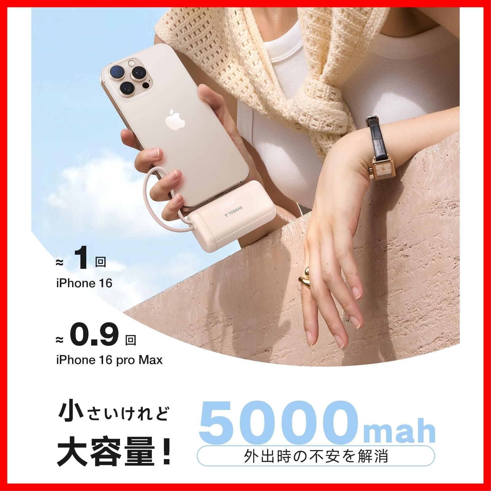 TORRAS モバイルバッテリー 3 c PSE認証取得 2025 小型 軽量 22 5 W急速充電 タイプc ケーブル内蔵 直差し 5000 mAh 過熱防止 機内持ち込み かわいい コンパクト 2台同時充電 収納便利 iPhone 17 16