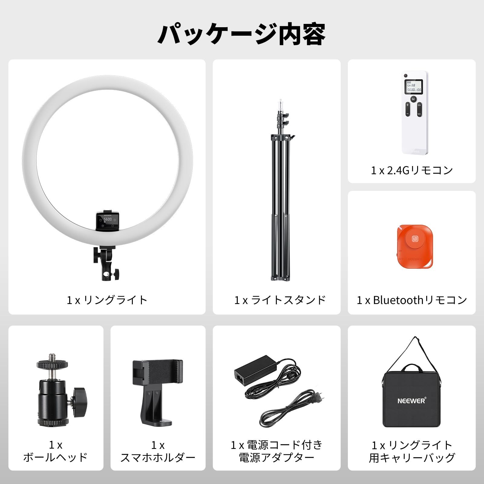 【セット内容&安心】1×SRP18 リングライト、1xライトスタンド、1xスマホホルダー、1×電源アダプター、1 x リモコン、1×キャリングバッグ。日本語取扱説明書も同梱していますので、ご安心ください。また、ご使用中何かご質問がございましたら、お気軽に弊社のカスタマーサポートまでお問い合わせください。