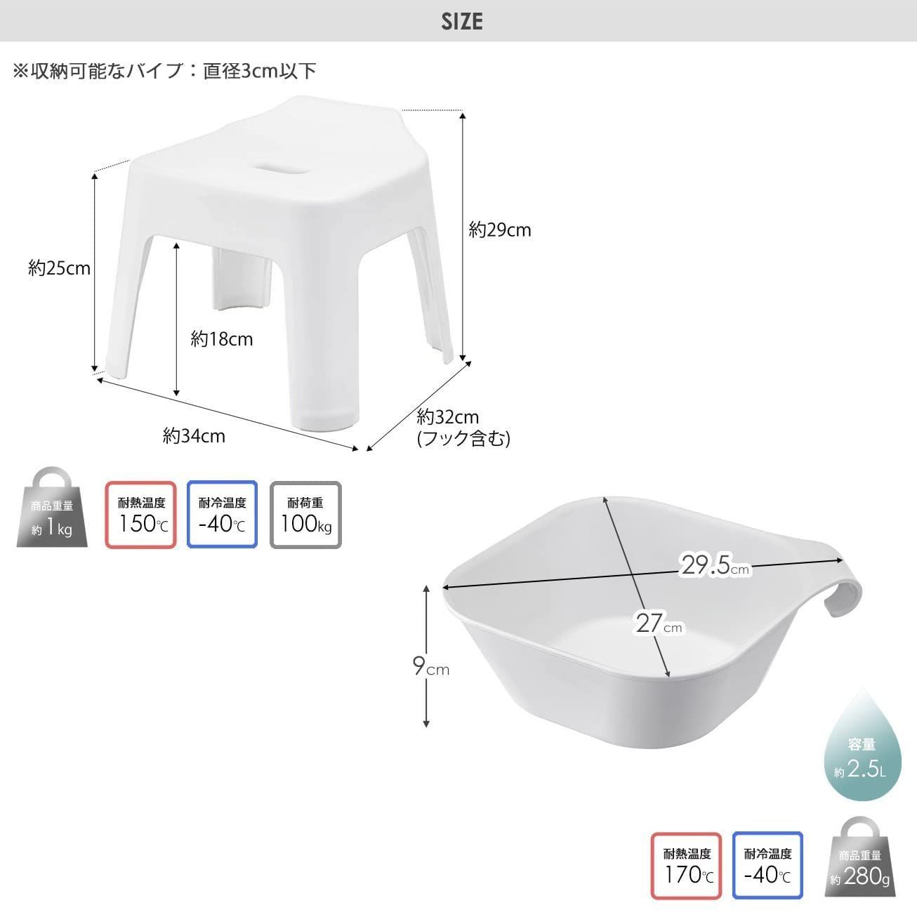 [仕様]完成品、生産国:中国、【風呂イス】耐荷重:約100kg、耐熱温度:150℃、耐冷温度:-40℃、収納可能なパイプ:直径 約3cm以下 / 【湯おけ】容量:約2.5L、耐熱温度:約170℃、耐冷温度:約-40℃、取り付け可能な壁面:マグネットが付く平らな面・スチール壁面、取り付け可能なパイプ:直径約3cm以下