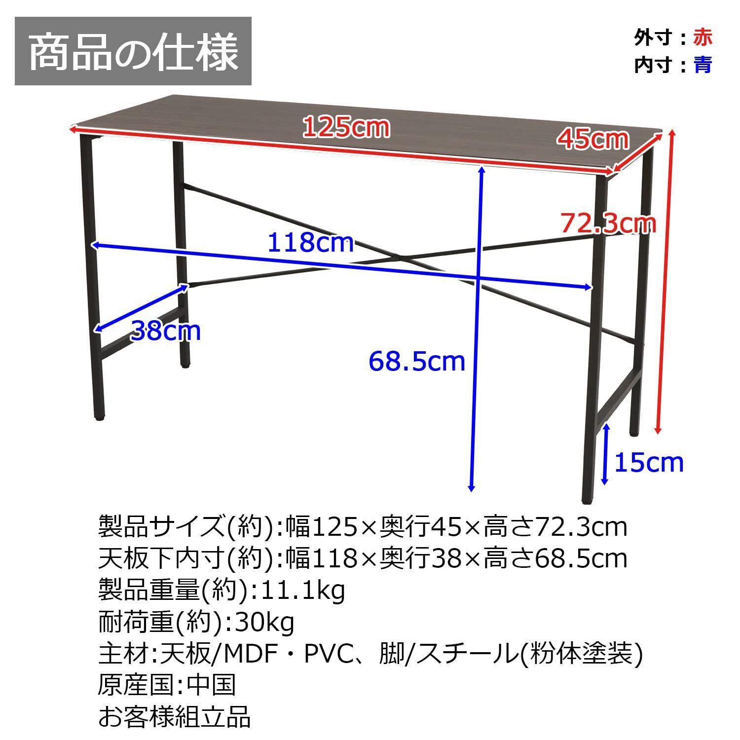 商品サイズ(約):幅1250×奥行450×高さ723mm、内寸(約):床から天板までの高さ/685mm、フレーム間幅/1180mm、フレーム間奥行/380mm、床から横桟までの高さ/150mm
