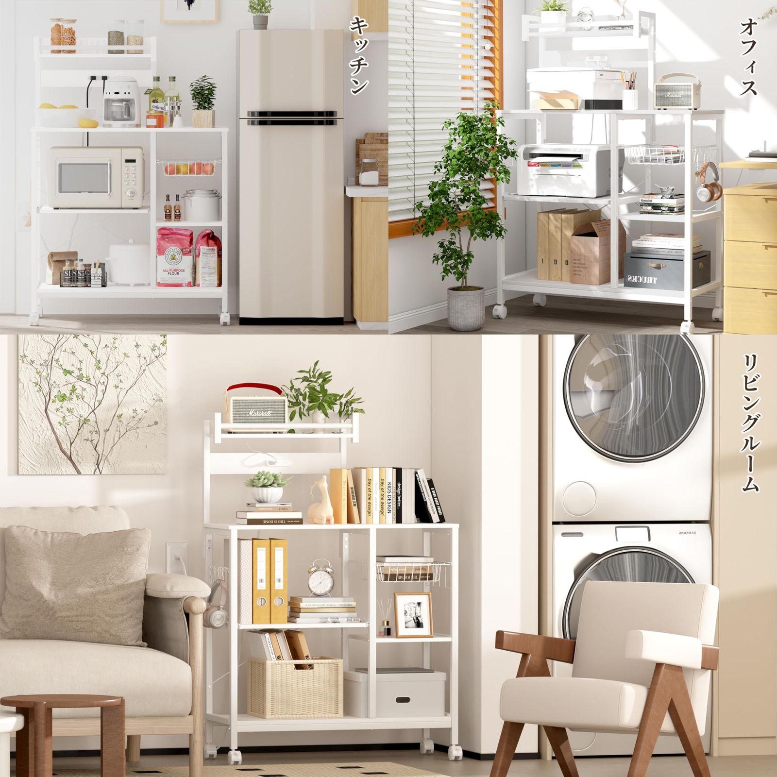 【多機能収納ラック】レールで棚板をスライドできます。引出の構造について通気性がいいワイヤーバスケットなので、落としやすい小物が収納できます。レンジ台やプリント台を置くときにも使いやすい。上の棚板は調味料入れや調理器具などを落下防止構造なので、安心しながらまとめて収納できます。
