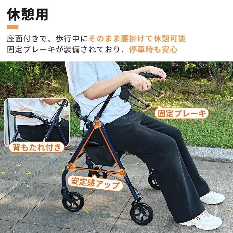 【歩行サポートと休憩を一台で】本製品は、歩行を補助するだけでなく、疲れた時に座って休憩できる便利な2WAY設計です。クッション入りの座面と背もたれ付きで、腰かけた際も安心・快適です。移動と休憩を一台でこなせるため、外出中の負担を大幅に軽減します。