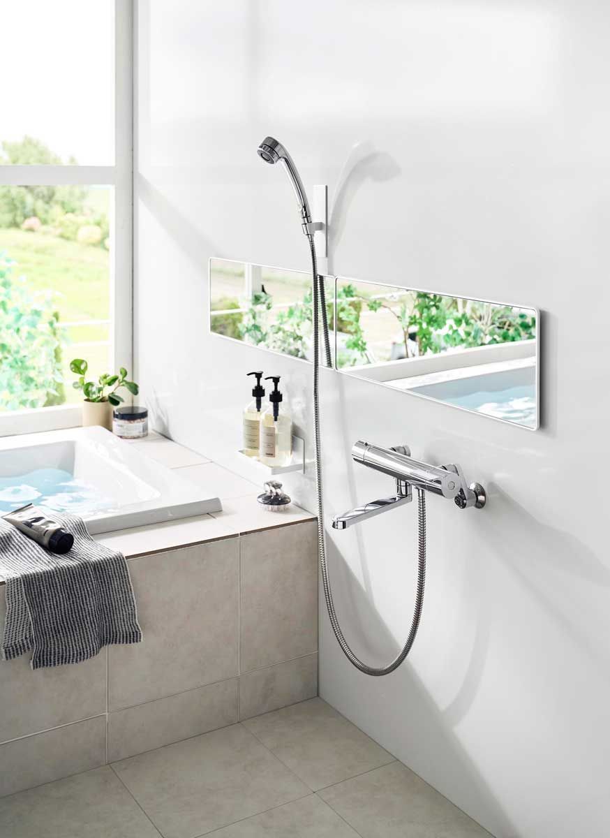 美しく、透明感があるロングサイズの角型ガラス製バスルームミラーです。フレームと壁の隙間に指を入れて取り外しやすい形状なので、お掃除がしやすく清潔に保てます。曇り止めフィルムを全面に粘着加工しているため、鏡面が曇らず快適にお使いいただけます。