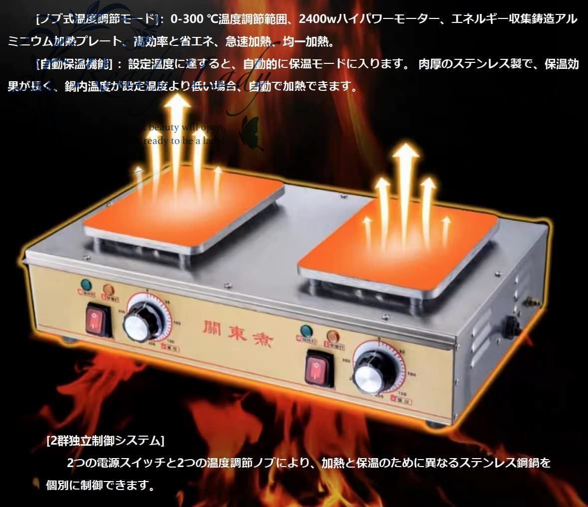 2、[ノブ式温度調節モード] 0-300 ℃温度調節範囲、2400wハイパワーモーター、エネルギー収集鋳造アルミニウム加熱プレート、高効率と省エネ、急速加熱、均一加熱。[自動保温機能] 設定温度に達すると、自動的に保温モードに入ります。 肉厚のステンレス製で、保温効果が長く、鍋内温度が設定温度より低い場合、自動で加熱できます。[2群独立制御システム]2つの電源スイッチと2つの温度調節ノブにより、加熱と保温のために異なるステンレス鋼鍋を個別に制御できます。