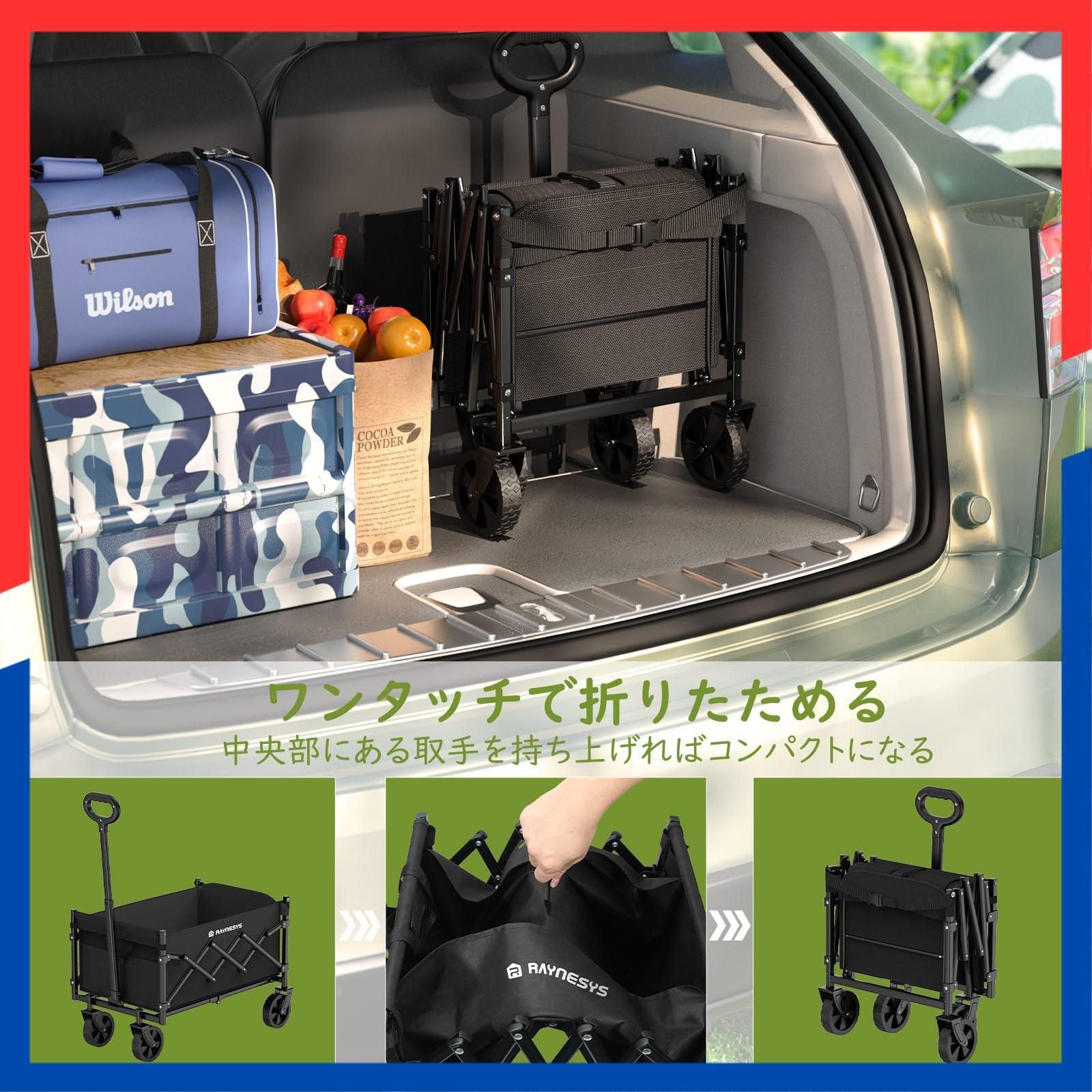 商品 2025新登場 後部展開可 長物対応 ミニ 超軽量5 7 kg 高耐荷重100 容量65 L 90 キャリーワゴン キャンプカート アウトドアワゴン 折り畳み式 持ち運び便利 コンパクト Raynesys 自立収納 静音 多地形対応 キャン