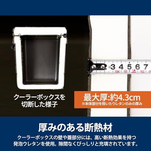 【製品詳細】 素材:ポリプロピレン(本体)、ポリウレタン(断熱材)・サイズ:約W55.3H38D31.4cm(本体)、約W41H27.5D23cm(内寸)・重量:約4.8kg・耐荷重:約80kg・断熱材の厚み:最大約4.3cm(最小約2.5cm)・ドリンクホルダー(上面2カ所)、目盛り(蓋部分、インチ表示)、栓抜き付き・容量目安(ペットボトル500mlの場合:約18本、ペットボトル2Lの場合:約4本(横向き)、350ml缶の場合:約30本)※自社調べ、保冷剤などの状況により変動します。・底面4か所にラバー付き・持ち手部分に握りやすいグリップ付き