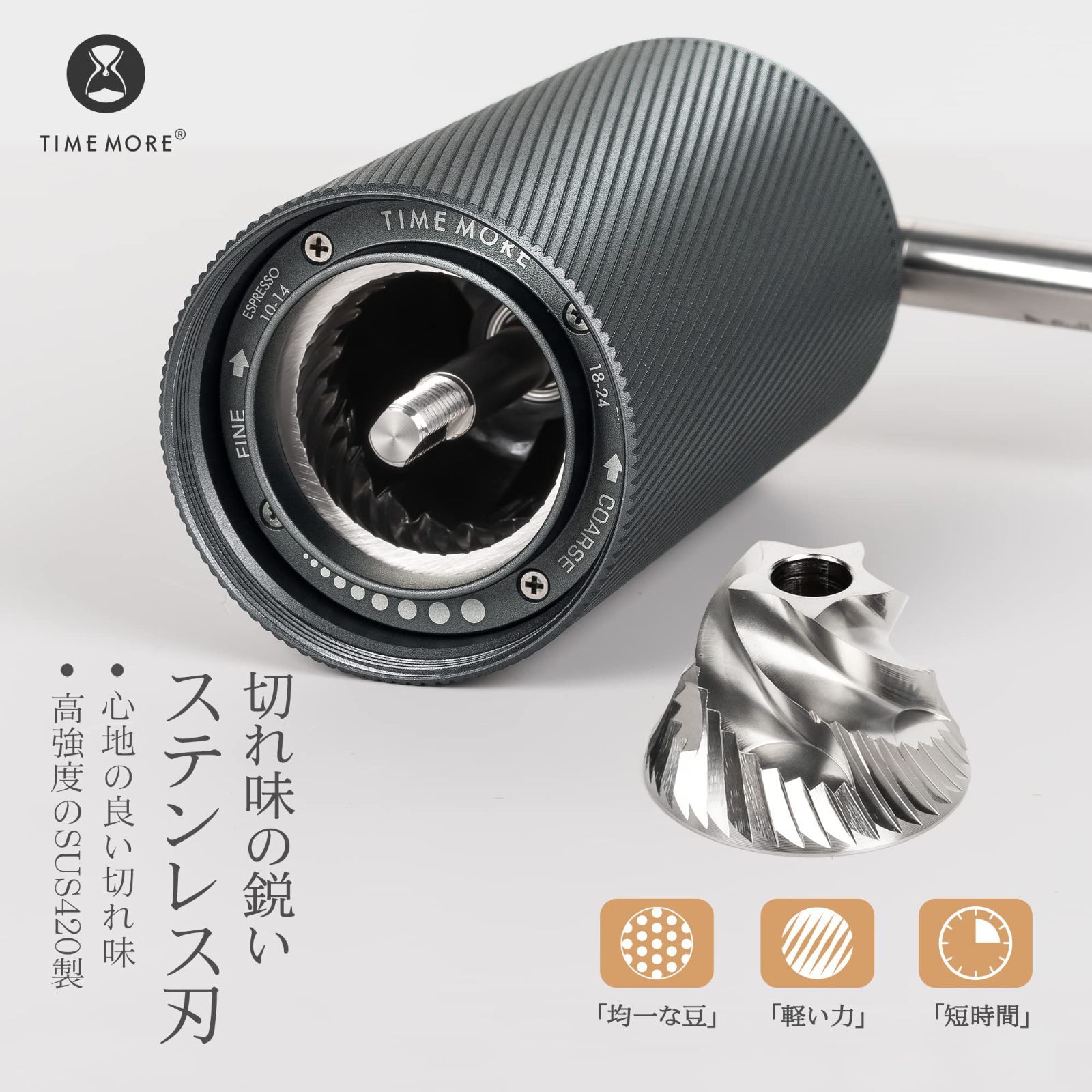 TIMEMOREタイムモア - C2 FOLD コーヒーミル 手動 折り畳み式ハンドル 持ち運びやすい 手挽き コーヒーグラインダー ステンレス臼 粗さ調整可能 軽量 外出用 旅行 お手入れ簡単 ブラシ付き 濃い灰色