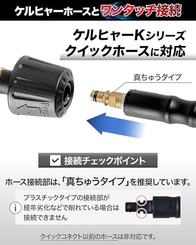 新登場!MJJCショートガンPROバージョンアップでスイベルが付属しましたMJJCフォームガンと組合せて使用すれば泡洗車が楽になるこちらの製品は、ケルヒャーKシリーズ高圧洗浄機の「クイックコネクトホース」に対応したショートガンです。(クイックコネクト接続部が「真ちゅうタイプ」のホースでの使用を推奨。【注意】クイックコネクト接続部が「プラスチックタイプ」の場合、経年劣化によりツメ(凹凸)が削れている場合は接続できません。クイックコネクト採用前の古い機種のホースには接続不可。OC3、KHB5、業務用HDシリーズは接続不可。)