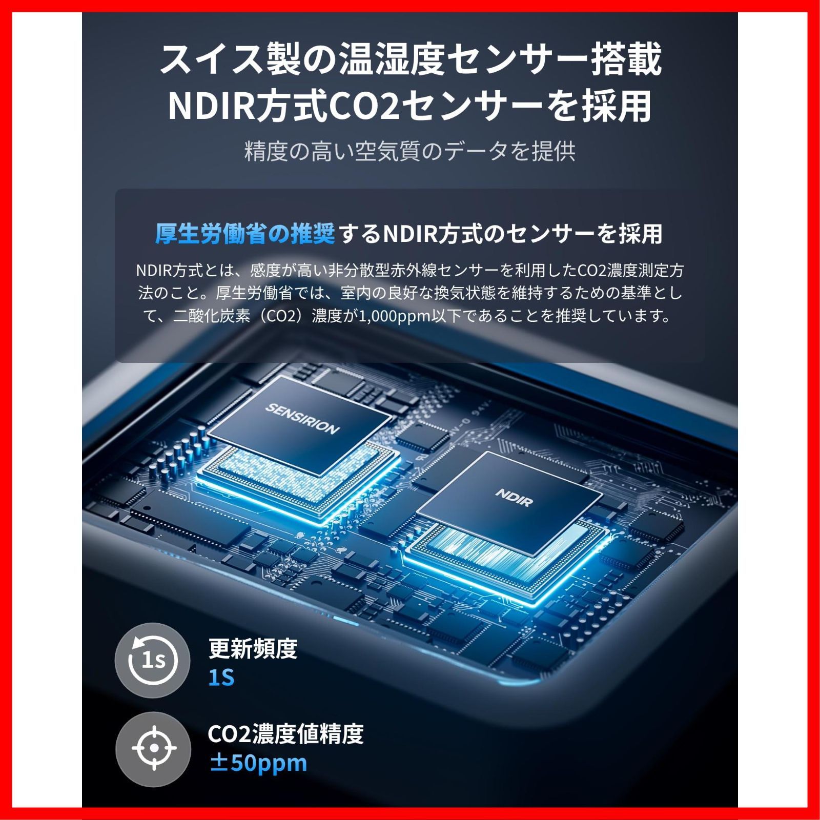 【NDIR方式CO2センサーとスイス製の温湿度センサー搭載】厚生労働省の推奨するNDIR方式のCO2センサーを採用し、高精度な空気質のデータを提供。厚生労働省では、室内の良好な換気状態を維持するためには、二酸化炭素濃度が1000ppm以下であることを推奨しています。さらに、信頼性の高い高精度な温湿度センサーを搭載し、常に最新の正確なデータを提供します。