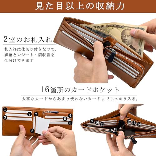 【17枚カード収納の驚きの収容量】コンパクト設計ながら、17枚カード収納可能な財布 コンパクトモデル。よく使うカード6枚分のスロット、隠しポケット2つ、紙幣入れ内部に8スロットを装備。外側には大き目のフリーポケットがついていて、診察券・ICカード・領収書まで収納可能。さらに、サイズは12.7cm9.7cm2cm、重さ約120gの軽量でポケットに収まるさいふ。見た目以上に収納力のある財布 メンズ 2つ折りとして、日常・通勤で大活躍。