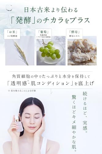 日本古来より伝わる「発酵美容成分」を配合:お米(コメ発酵液)、葡萄(乳酸桿菌/ブドウ果汁発酵液)、酵母(酵母エキス)
