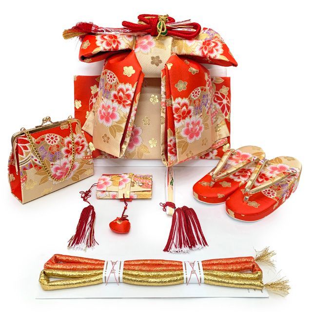 7歳女の子用の正絹のお着物に、結び帯や箱せこセット、着付けに最低限必要な小物を揃えたフルセットです。