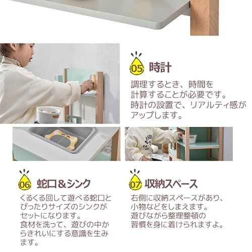 【POINT4 細かいところまで配慮】磁石設計の扉:ぱっと扉が閉まったら、指を挟む恐れがあります。収納スペース:本体下部には収納スペースがあり、おままごと器具やおもちゃンなどをいっぱいれ、お片付けの習慣も身に着けますよ。時計: 時計の設置で、リアリティ感がアップします!飾り棚:本体上部の飾り棚で、お好みの雑貨やおもちゃの調味料を置くことができます。コンロのつまみ:コンロのつまみはすべて回すとカチカチと音を鳴らしながら360度回せます。蛇口&シンク:くるくる回して遊べる蛇口